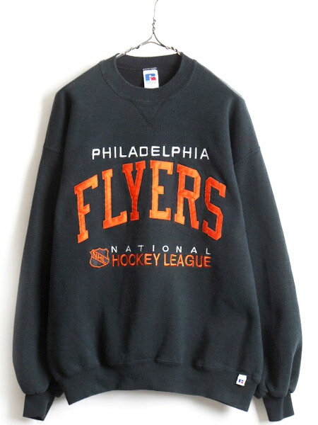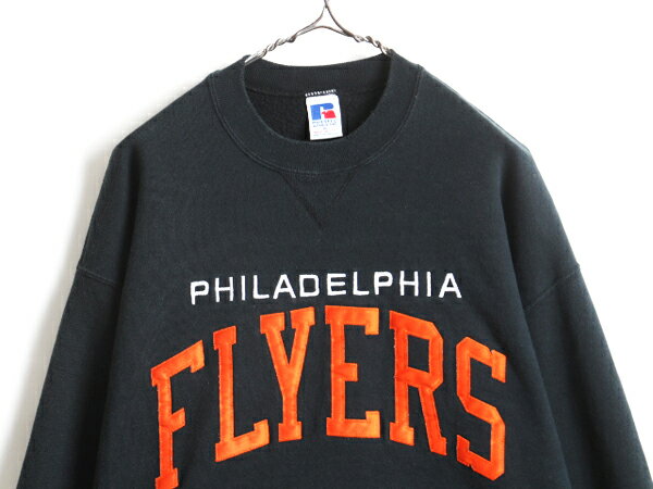 90's USA製 ■ NHL フィラデルフィア フライヤーズ 刺繍 ロゴ スウェット トレーナー 黒 ( メンズ XL ) 古着 RUSSELL ラッセル ホッケー| 中古 90年代 アメリカ製 オールド 大きいサイズ クルーネック 裏起毛 アイスホッケー PHILADELPHIA FLYERS ブラック アメカジ