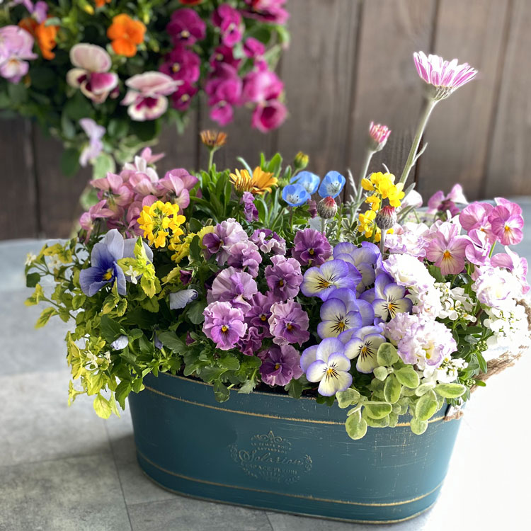 商品内容 ・ブリキ缶寄せ植え ・管理方法マニュアルプリント ・主要植え込み植物についての詳細マニュアルプリント 使用植物 旬の花苗たち店長おまかせ 容器サイズ 鉢サイズ:幅29cm×奥行き15,5cm×高さ12,5cm 開花期 11月〜4月上旬出荷分・・秋から春にかけて開花(最長5月ごろまで) 4月中旬〜10月出荷分・・夏から秋にかけて開花 (最長11月ごろ)まで 管理のポイント 【置き場所】 屋外専用に作成します。