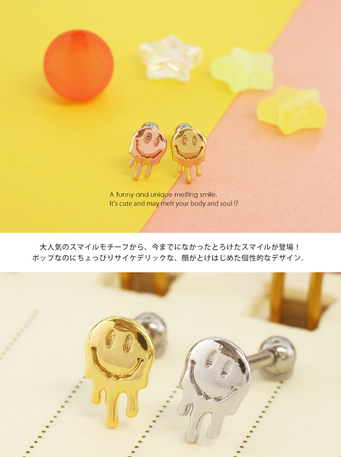 アイテムキーワード ボディピアス 16G 軟骨ピアス 軟骨 ピアス 軟骨用 ストレートバーベル スマイル メルティ とろける 溶ける 可愛い ニコちゃん にこにこ Smile 笑顔 コミカル 個性的 レア ユニーク ボディーピアス◆オススメポイント◆ 大人気のスマイルモチーフから、 今までになかったとろけたスマイルが登場! ポップなのにちょっぴりサイケデリックな、 顔がとろけはじめた個性的なデザイン。