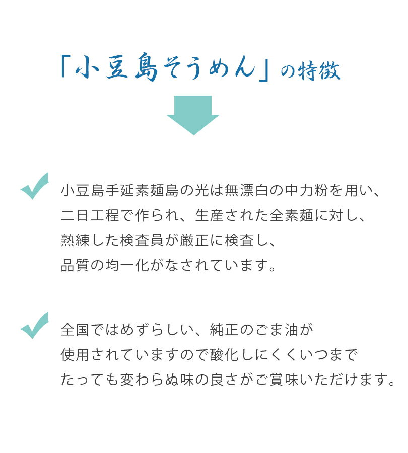 江戸時代の初め(慶長3年)から400年の伝統にささえられた独特製法で作られた小豆島特産の「手延べそうめん・島の光」完全・寒製麺のため何日も晴天が続く冬の日、肌にしみる寒風の澄きった空気の中天日乾し・自然乾燥の2日工程で手延麺の味とコシを造り上げています。