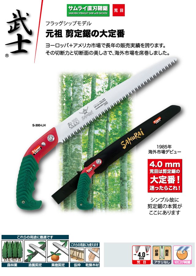 サムライ鋸 直刃 武士 240mm S-240-LH軽く、早く、楽に切れるのこぎりです(サムライ さむらい 鋸 ノコギリ 造園 切る 切味 のこぎり 切れる 鞘 さや サヤ 木工 剪定ノコギリ 鋸 庭木 ガーデニング 摘果 剪定 果樹 木材 木 神沢精工)
