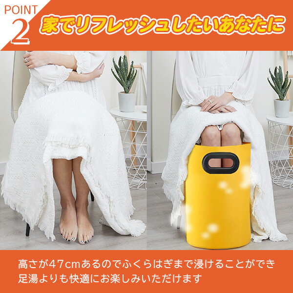 ポイント2家でリフレッシュしたいあなたに...高さが47cmあるのでふくらはぎまで浸けることができ足湯よりも快適にお楽しみいただけますポイント3防水で安全な素材のため水漏れの心配は一切なし!形を維持して倒れることはありません。