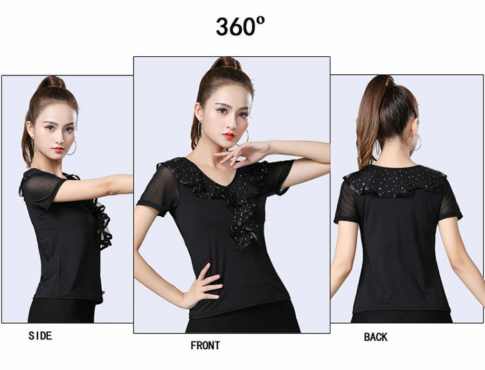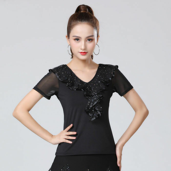 ダンストップス 社交ダンス 衣装 胸元フリル スパンコール トップス ダンス衣装 レッスン着 ラテンダンス モダンダンス ダンスウェア 練習着 コーラス衣装 ダンス着 シースルー 社交ダンス 衣装 レッスン 練習着 レッスンウェア レディース