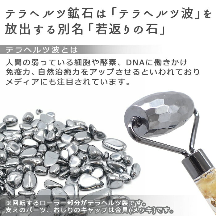 【商品仕様】 ・全長/約14.5cm ・持ち手軸径/約1.2cm ・ヘッド部分/約6cm×3.5cm ・天然石ローラー(テラヘルツ)/約4.5cm×2cm ※多少の個体差がございます。