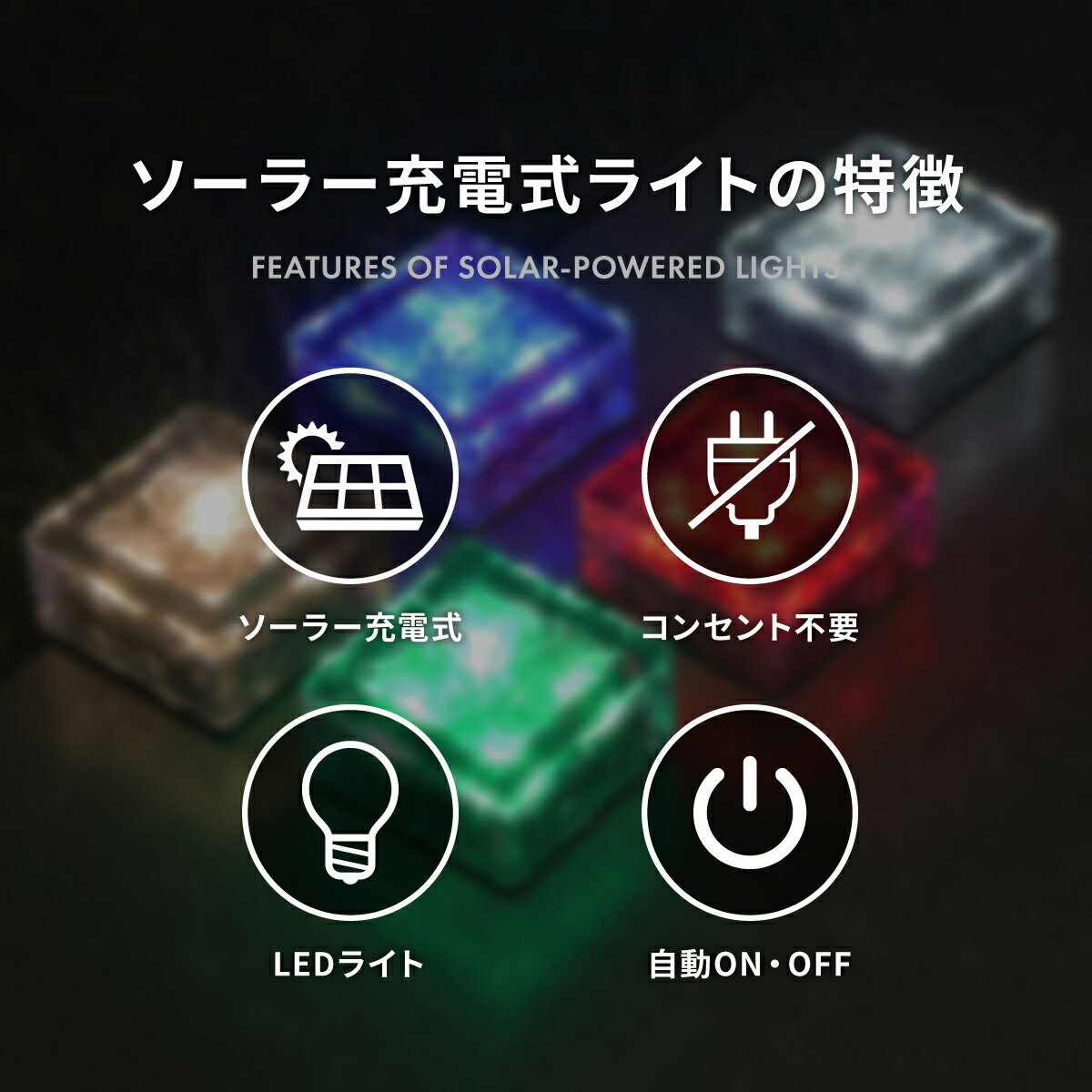 商品仕様 品番 U-128 サイズ 高さ:5cm 横幅:7cm 奥行き:7cm カラー ホワイト イエロー レッド グリーン ブルー 光源 LEDライト(4個) 電池規格 1.2V 600mAh ニッケル水素電池 単4形 生産国 中国 商品説明 華やかな灯りをあなたのお庭やお部屋に ソーラーガーデンライト ▼▼ここがポイント▼▼ 【ソーラーガーデンライトの特徴】 ・ソーラー充電式 ・コンセント不要 ・LEDライト ・自動ON、OFF 【ソーラー充電式設計】 充電式なので電源不要。