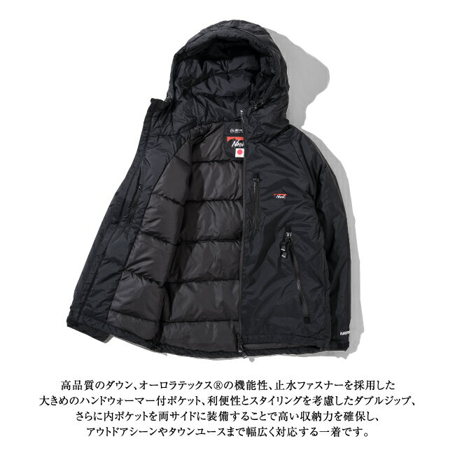 【素材】表地:AURORA-TEX (オーロラテックス) ナイロン 100%裏地:50dnポリエステル 100%羽毛:ダックダウン 80%-20% (650FP) 122g ※モニタやPC環境等により実物と多少色合いが異なって見える場合もございます。