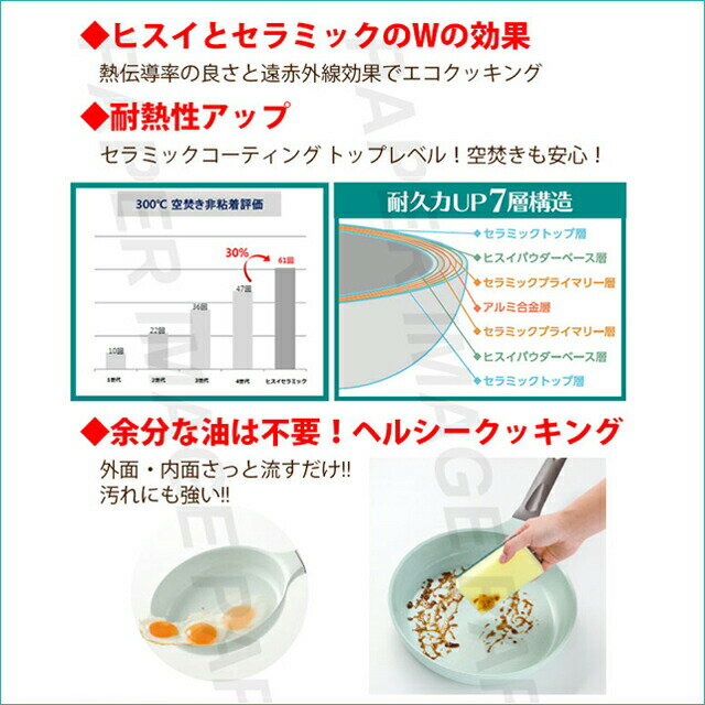 商品説明 ●ヒスイとセラミックのWの効果 熱伝導率の良さと遠赤外線効果でエコクッキング ●耐熱性アップ セラミックコーティング トップレベル 空焚きも安心!! ●余分な油は不要!ヘルシークッキング 外面・内面さっと流すだけ!!汚れにも強い!! ●外側もセラミックコーティングだから、外側の汚れに強い! ●ロングライフコーティング 脅威の硬度:9H以上を実現!! ●軽く、そして頑丈! アルミダイキャスト製 ●安全・安心のコーディング PFOA FREE サイズ サイズ:径行20cm×4.2cm 材質 【表面加工】 内面:セラミック塗膜加工/ 外面:セラミック塗膜加工 【材料の種類】 本体:アルミニウム合金/底部:鉄溶射加工/取っ手:メラミン樹脂 【オススメ商品】 【ポイント10倍】☆
