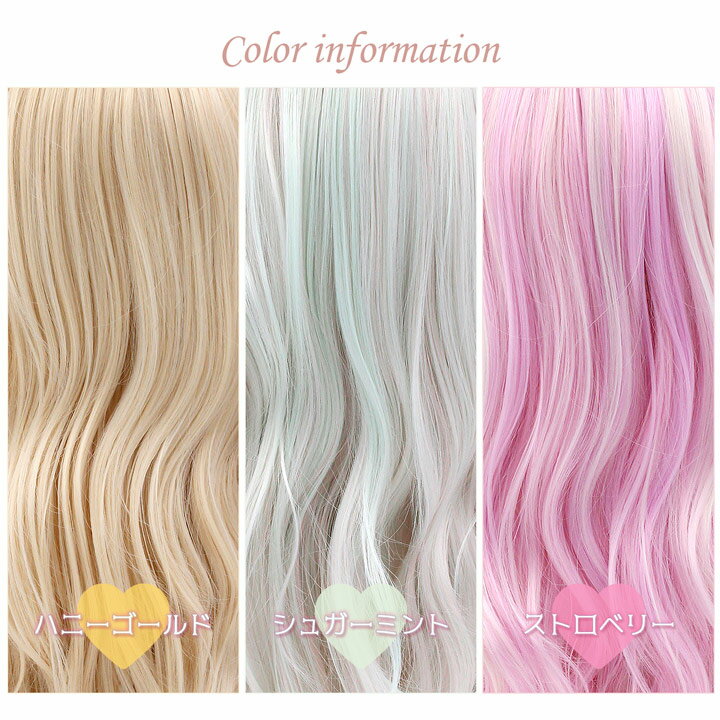 ITEM NO. 【FG1】 Fairy キャンディ セット内容 ウィッグ本体、バンス付き毛束×2、ウィッグネット、ガイドブック台紙、保管用ビニール袋、クリアBOX SIZE フリーサイズ(頭周り約56cm) 髪の長さ 【ストレート】 ・Front 約14cm〜15cm ・Side 約64〜66cm ・Back 約75〜78cm ・バンス 約60〜63cm 【ウェーブ】 ・Front 14cm〜15cm ・Side 約55〜60cm ・Back 約65〜70cm ・バンス 約48〜50cm つむじの型 I型 人工頭皮 あり 重さ 【ストレート】570g (本体270g、バンス300g) 【ウェーブ】620g (本体280g、バンス340g) 素材 耐熱性高品質ファイバー(160度まで) 製法 ミシンメイド 使用方法 ウィッグのかぶり方・保管方法・お手入れの仕方はこちらから 免責 ※初めてブラッシングをする場合、毛が抜け落ちますが、品質には問題ございません。