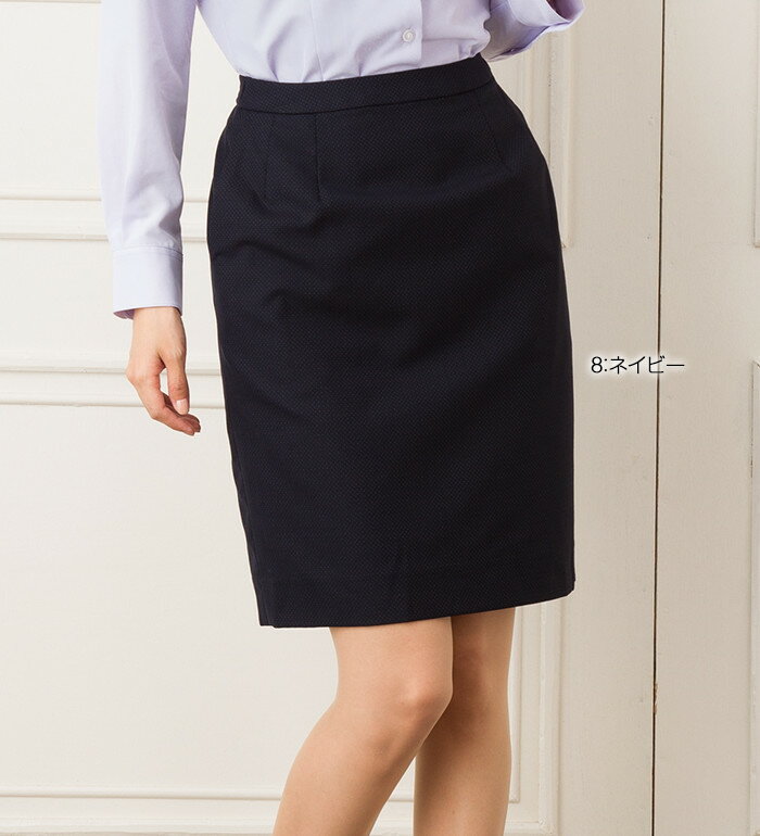 ディティール 両脇ポケット 左脇ホック&ファスナー センターベント 後ろゴム仕様 カラー 8:ネイビー(紺) 16:ブラック(黒) 素材 コーデュラドット:毛38% ポリエステル37% ナイロン25% 制電 オールシーズン素材 サイズ ウエスト ヒップ スカート丈 5号 59 92 53 7号 61 94 53 9号 64 96 54 11号 67 98 54 13号 70 100 55 15号 74 103 55 17号 79 107 56 19号 84 112 56