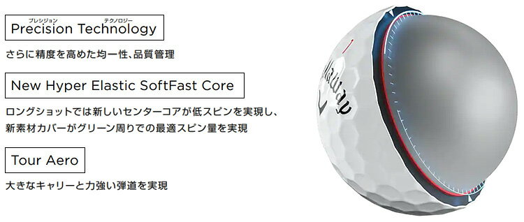 ・マイナーチェンジ変更(2022年3月4日) 前作からの変更点 (旧)シングル・ソフトファスト・コア → (新)ハイパーエラスティック・ソフトファスト・コア (旧)ヘックス・エアロ・ネットワークパターン → (新)ツアーエアロテクノロジーメジャー王者からアマチュアまで、優れたトータルパフォーマンスでそのプレーを支える、キャロウェイのツアークオリティボール、CHROME SOFTシリーズが、さらに進化を果たしました。