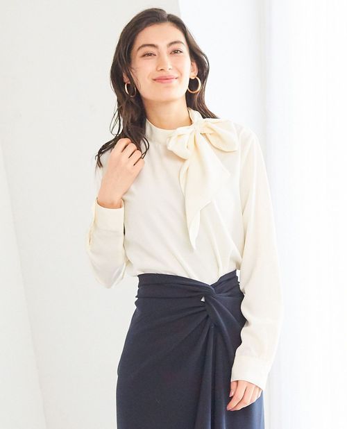 厚手ツイル風リボンボウタイブラウス透け感の少ない生地を使用した、ビジネスシーンにも安心して着用できるボウタイブラウスです。