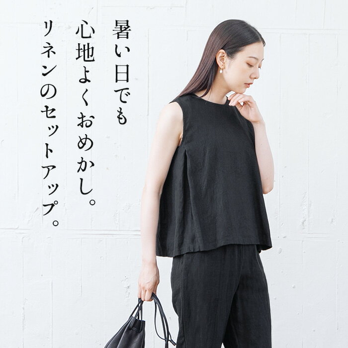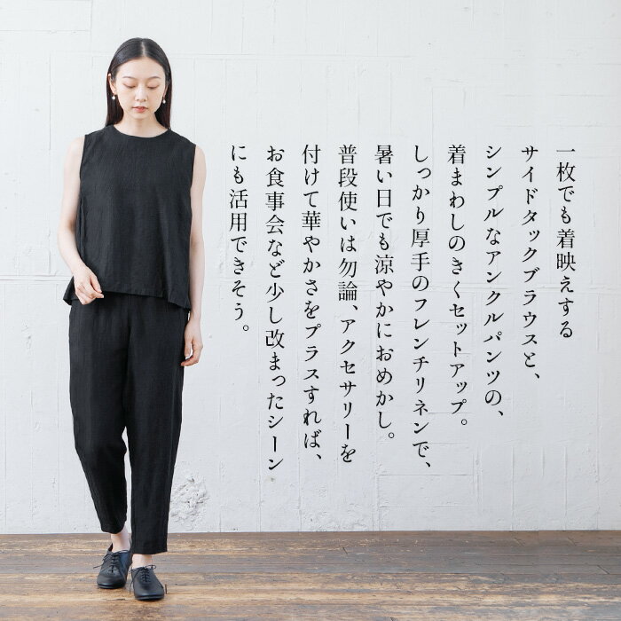 【新作】[ セットアップ レディース カジュアル 夏 40代 ] しっかり厚手 フレンチリネン100% ヘビーキャンバス サイドタック ブラウス + アンクルパンツ セット / 日本製 50代 60代 30代 女性 ファッション ノースリーブ リネン 麻100 【レビューでクーポン】
