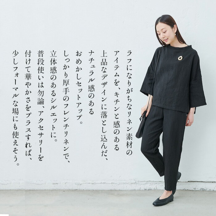 【新作】[ セットアップ レディース 40代 きれいめ おしゃれ 着痩せ ] しっかり厚手 フレンチリネン100% ヘビーキャンバス モックネック + アンクルパンツ セット / 日本製 50代 60代 30代 女性 ファッション リネン ブラウス シャツ 麻100 【レビューでクーポン】