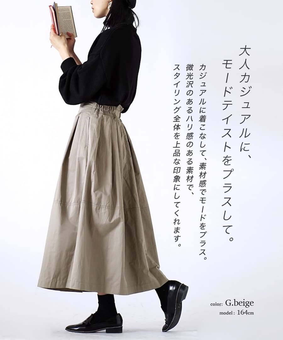 素材感とシルエットでどことなくモードに着こなしていただけるスカート。