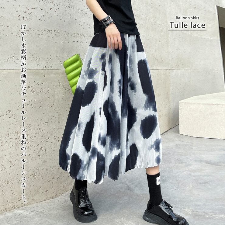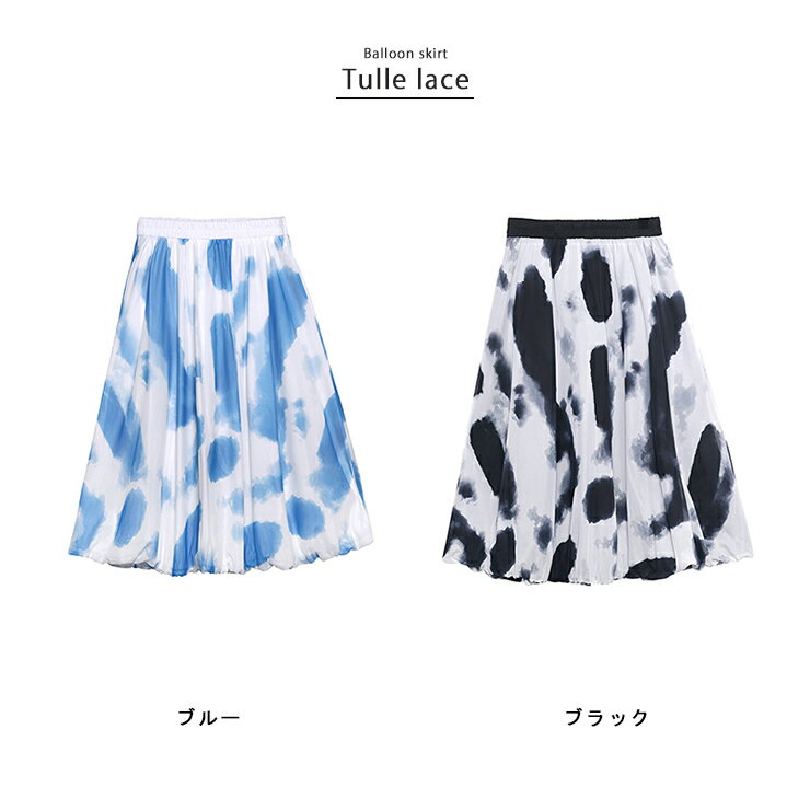 大きいサイズ レディース バルーンスカート ぼかし水彩柄 ミモレ丈 ウエストゴム LL 3L 4L 5L 6L ブラック ブルー 10代 20代 30代 40代 50代 13号 15号 17号 19号 21号 新入荷 ネコポス不可