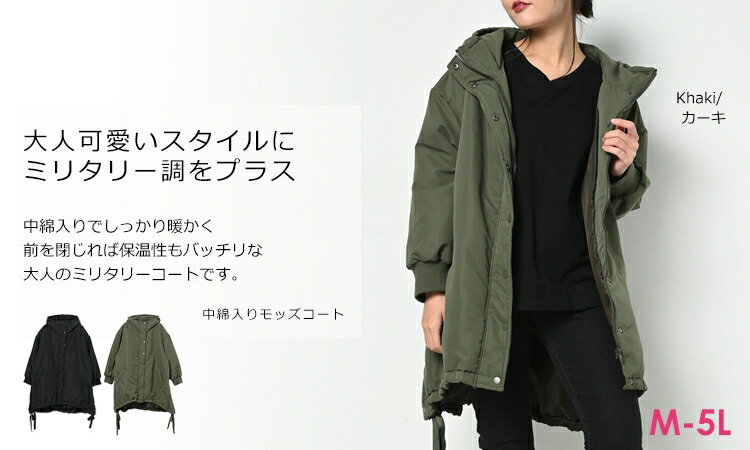 大きいサイズ レディース 中綿モッズコート ジップアップ 長袖 ミドル丈 ミリタリー フード アウター M/LL/3L/4L/5L ゆったりサイズ ぽっちゃり女子 プラスサイズ