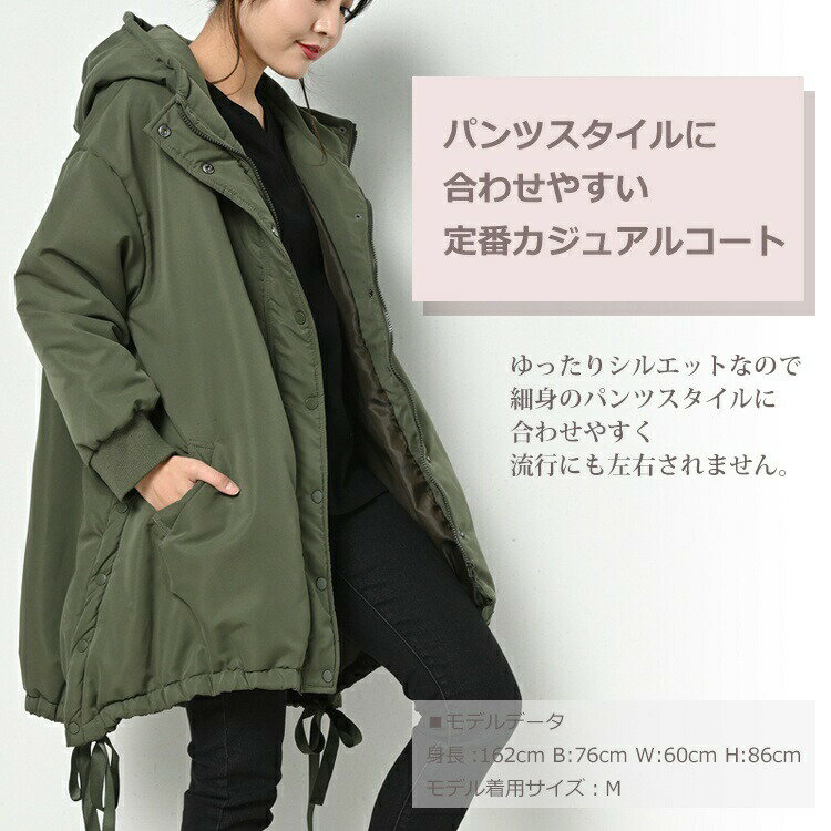 大きいサイズ レディース 長袖アウター 中綿コート ミドルコート 中綿モッズコート ミリタリーコート ミドル丈 ミディアム丈 コクーンシルエット あったかい 保温 裏地あり ボタン ジップアップ ファスナー ZIP ポケット 裾リボン 裾紐取り外し可能 サイドスリット シルエットアレンジ 無地 ゆったりシルエット BIGシルエット 大きめ ゆとり リラックス カジュアル ナチュラル フェミニン マニッシュ 秋服 冬服 冬物 冬コート おしゃれ おすすめ きれいめ かわいい かっこいい 大人 普段使い デイリー 着こなし コーデ 通勤 オフィス 女性 婦人用 30代 40代 50代 2021 秋 冬 黒 緑 グリーン アースカラー M LL 3L 4L 5L 9号 13号 15号 17号 19号 pm-aw-jk0615大人可愛いスタイルにミリタリー調をプラス!中綿入りモッズコート。