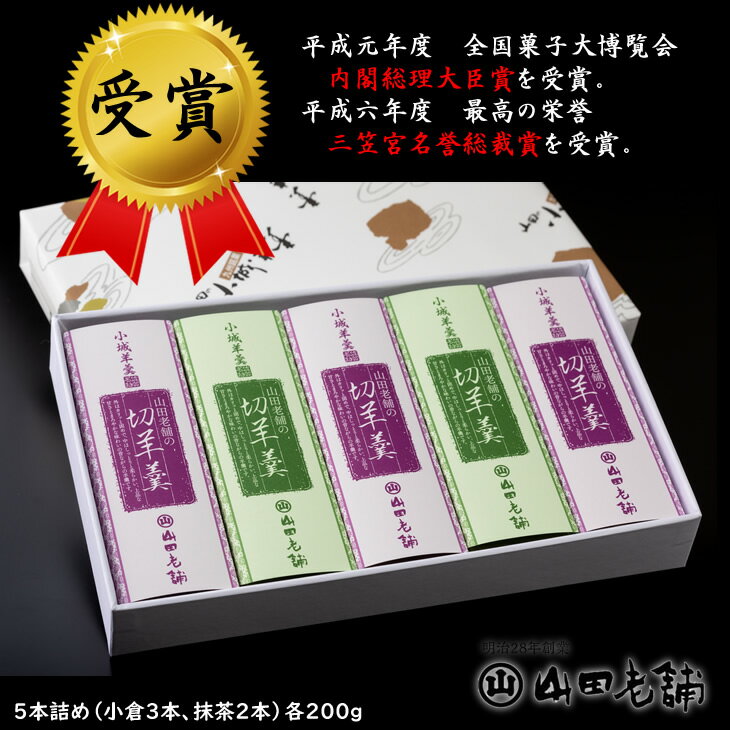 提供:山田老舗 内容: 切羊羹(小倉)×3本(各200g) 切羊羹(抹茶)×2本(各200g) 【注文内容確認画面の「注文者情報」を寄附者の住民票情報とみなします】 ・必ず氏名・住所が住民票情報と一致するかご確認ください。
