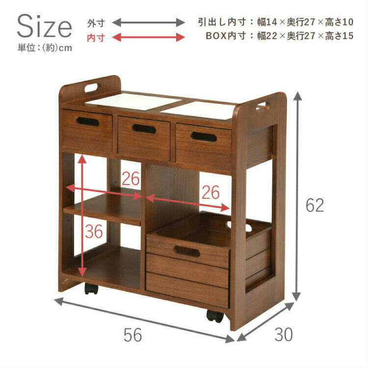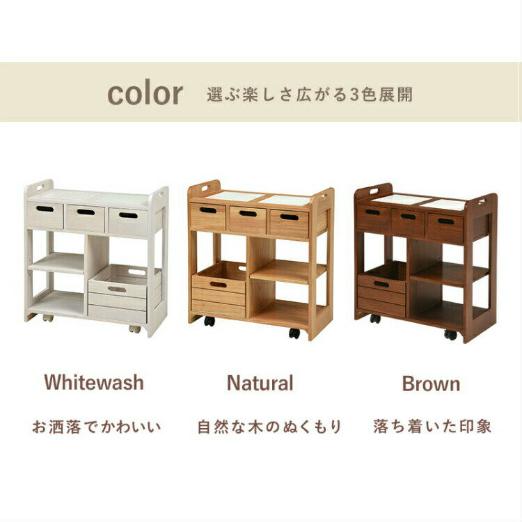 収納力も見た目にも大満足 サイズ (約)幅56×奥行30×高さ62cm 材質 主材:桐材 カラー ホワイトウォッシュ色、ナチュラル色、ブラウン色 備考 お客様組み立て品 天板:タイル付 キャスター付(内2個ストッパー付)