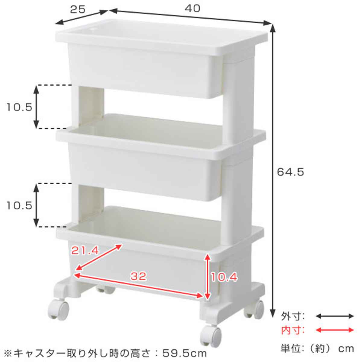 キャスターは取り外し可能で、取り付けない場合は高さが5cm下がります。