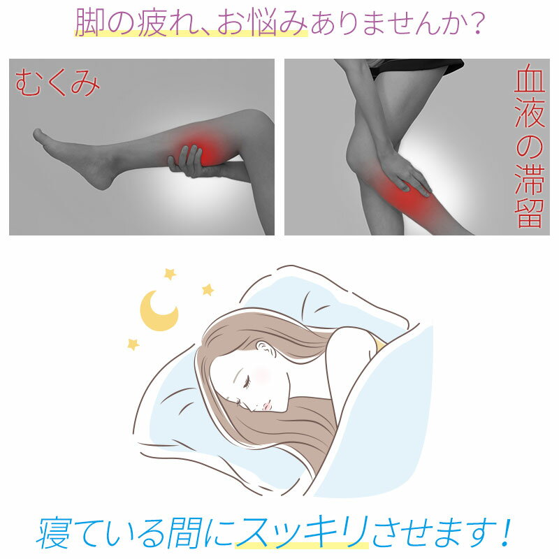【夜に着圧サポーターを着けると良い理由は?】 ・就寝時は、立った状態に比べて重力による負荷が軽減されるので、段階着圧による脚へのポンプアップ効果がより効率よく行われ、むくみを軽減するのに最適です。